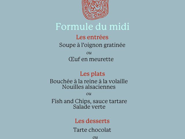 Soupe à l’oignon gratinée Ou Œuf en meurette ------ Bouchée à la reine à la volaille, Nouilles alsaciennes Ou Fish and Chips, sauce tartare, Salade verte ------ Tarte chocolat Ou Crème caramel