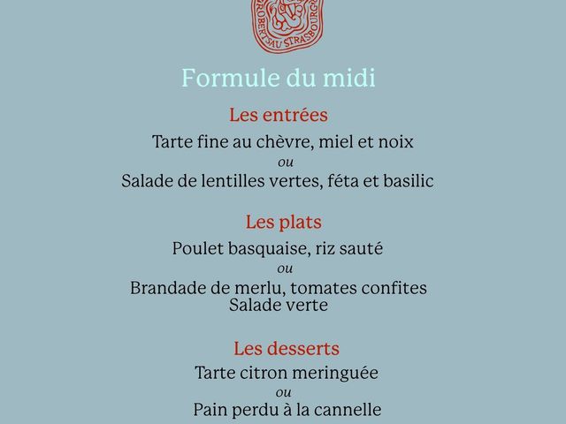 Tarte fine au chèvre, miel et noix Ou Salade de lentilles vertes, féta et basilic ------ Poulet basquaise, riz sauté Ou Brandade de merlu, tomates confites Salade verte ------ Tarte citron meringuée Ou Pain perdu à la cannelle