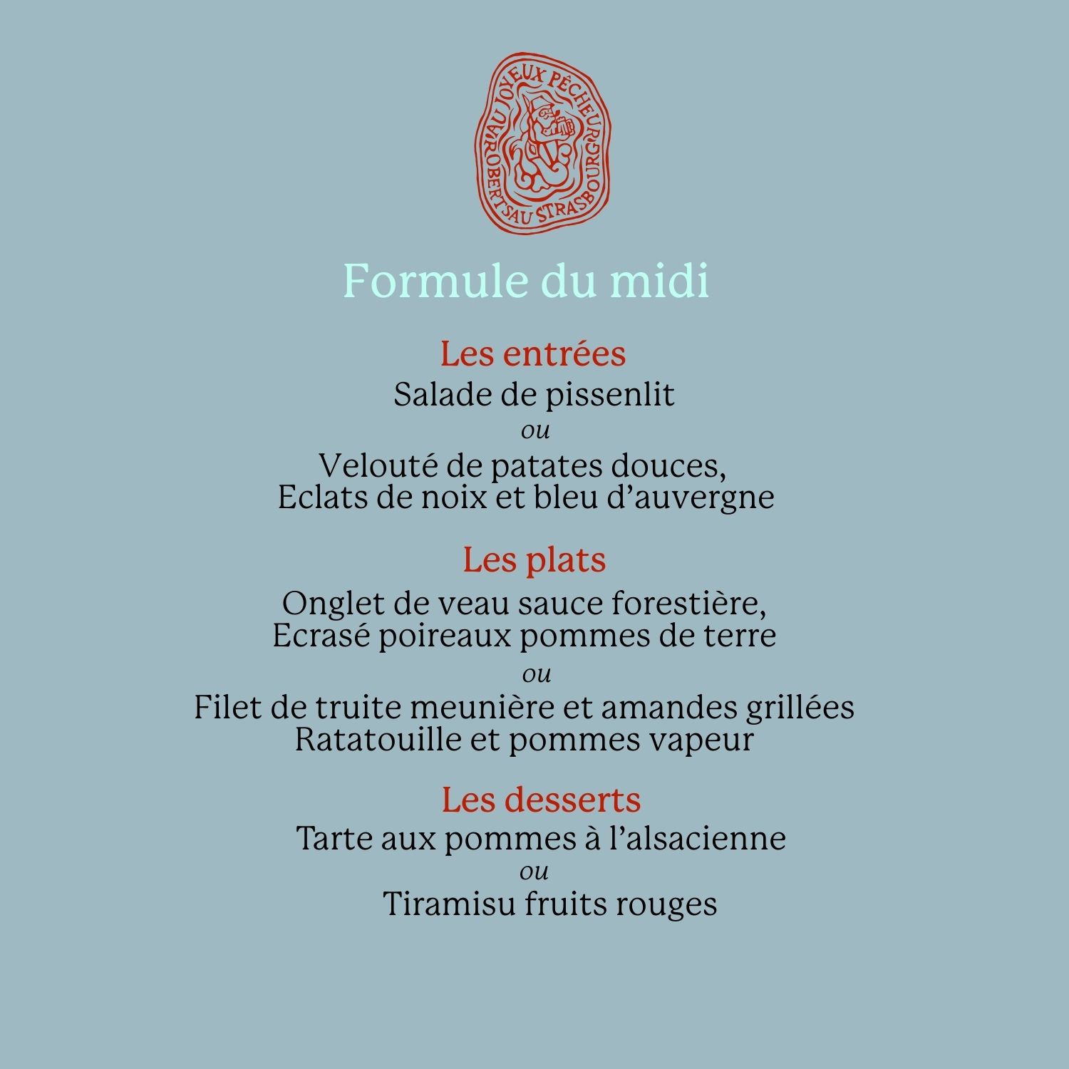Salade de pissenlit Ou Velouté de patates douces, Eclats de noix et bleu d’auvergne ------ Onglet de veau sauce forestière, Ecrasé poireaux pommes de terre Ou Filet de truite meunière et amandes grillées, Ratatouille et pommes vapeur ------ Tarte aux pommes à l’alsacienne Ou Tiramisu fruits rouges