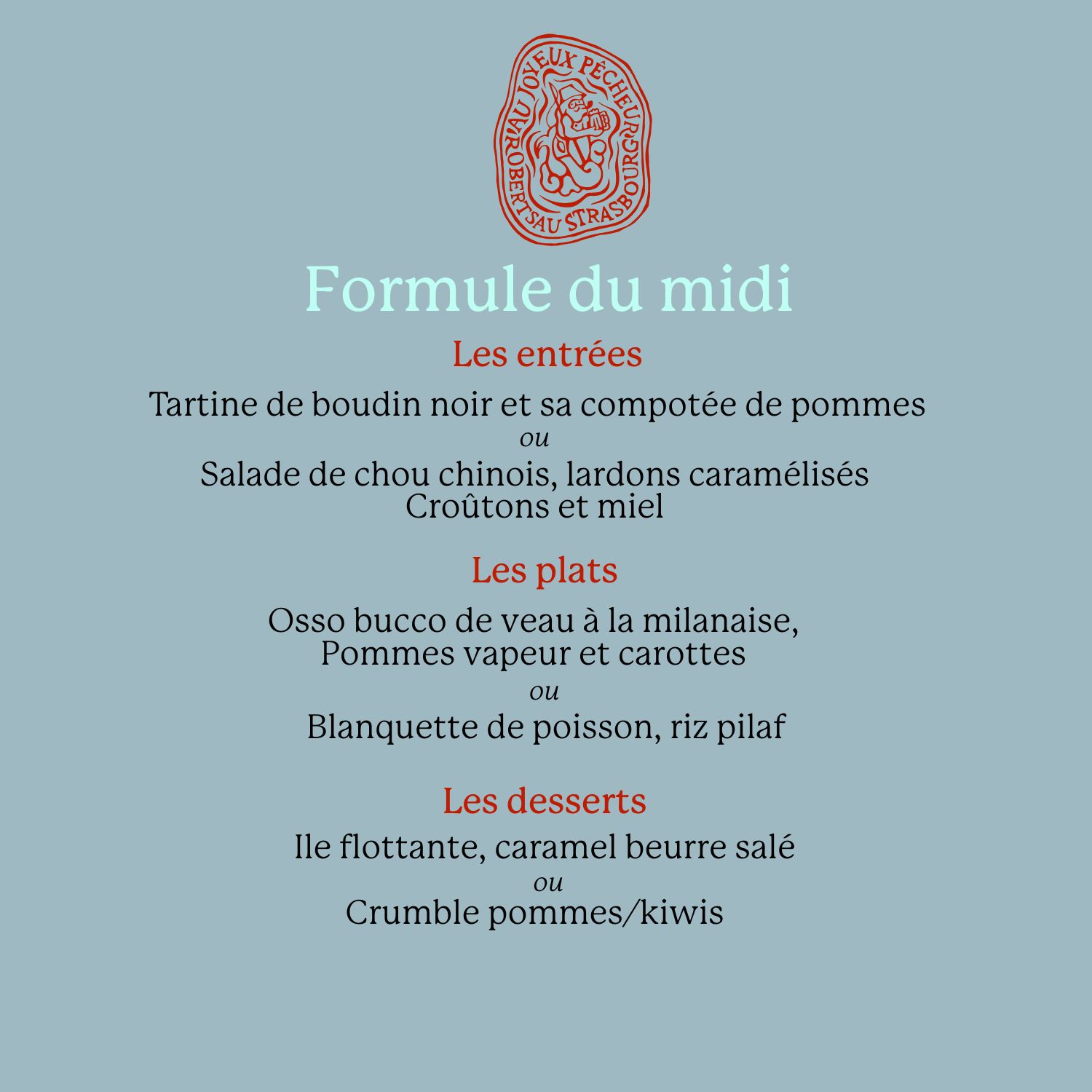 FORMULE DE LA SEMAINE DU MARDI 09/12 au VENDREDI 12/12/2025. Nous vous proposons chaque semaine une formule du midi comprenant: - deux entrées - deux plats - deux desserts au choix
