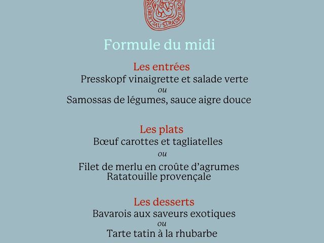 Presskopf vinaigrette et salade verte Ou Samossas de légumes, sauce aigre douce ------ Bœuf carottes et tagliatelles, ou Filet de merlu en croûte d’agrumes Ratatouille provençale ------ Bavarois aux saveurs exotiques Ou Tarte tatin à la rhubarbe