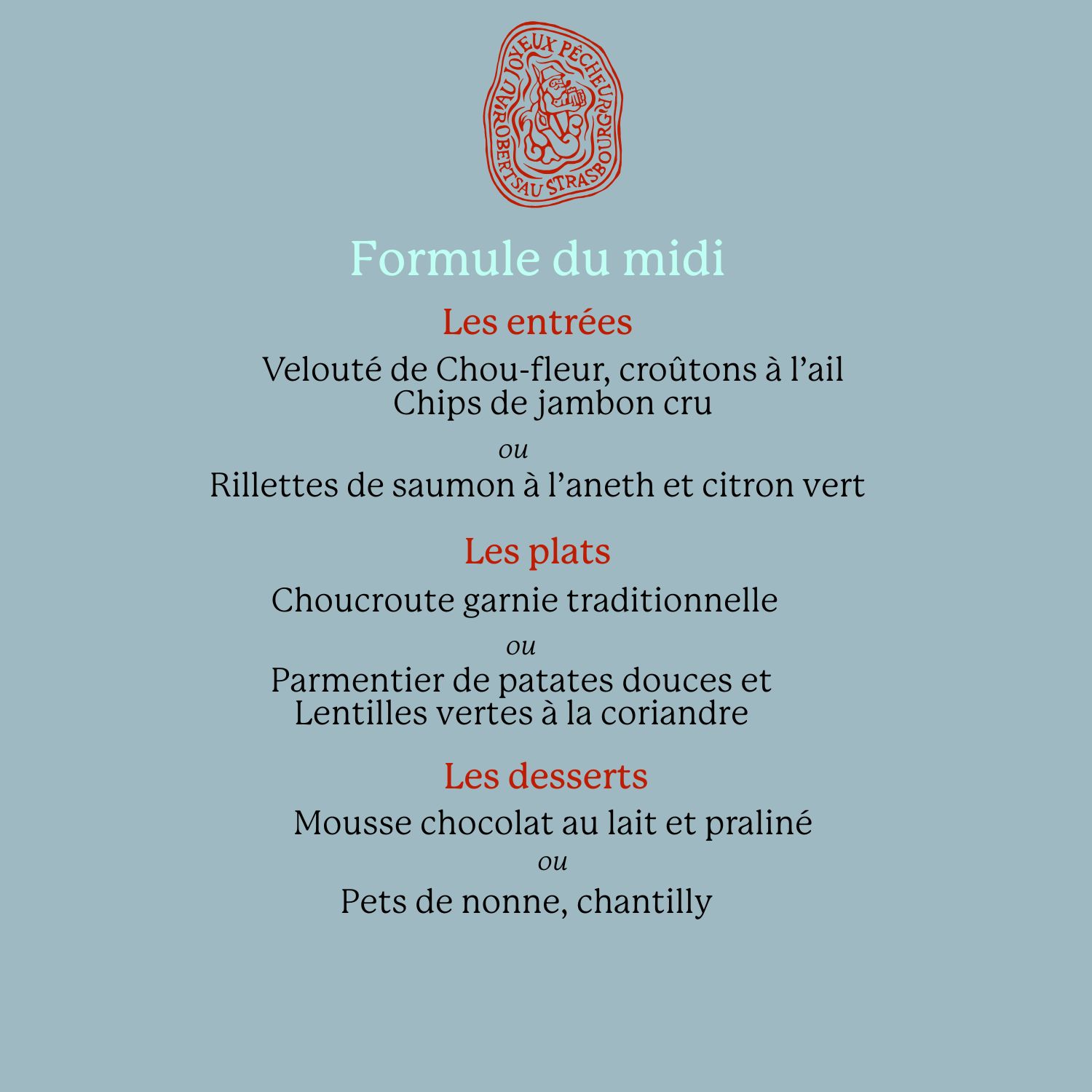 Rillettes de saumon à l’aneth et citron vert Ou Velouté de Chou-fleur, croûtons à l’ail Chips de jambon cru ------ Parmentier de patates douces et Lentilles vertes à la coriandre Ou Choucroute garnie traditionnelle ------ Pets de nonne, chantilly Ou Mousse chocolat au lait et praliné